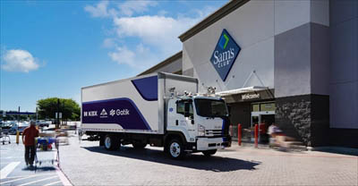 The Gatik trucks — standard straight trucks with a rollup door on an Isuzu FTR platform — will haul product from Georgia-Pacific facilities in the area and bring those items to 34 local Sam’s Club stores. The operation is running seven days a week.
